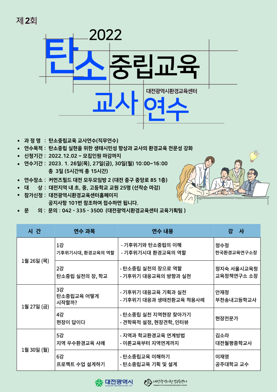 대전광역시환경교육센터는 기후위기 시대, 탄소중립교육을 위한 전문성과 생태시민성강화를 위한 ‘탄소중립교육 교사연수’를 진행합니다. 환경교육을 담당하시고 계신 선생님들의 많은 관심과 신청 바랍니다.